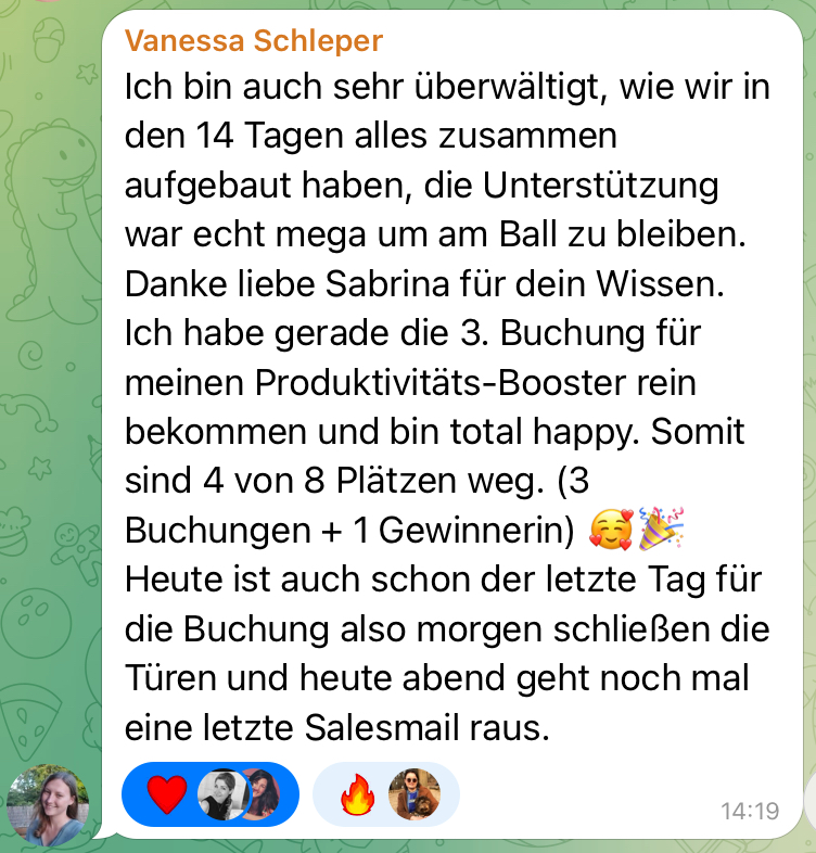 14 Tage wirst du durch die Community und mich zur Umsetzung motiviert. Das Ziel ist klar: deine Produktidee verkaufen.